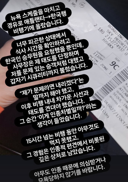 She added, “I had to endure cold looks and attitudes for the rest of the flight. That moment made me think, ‘Is this racial discrimination?’ I couldn’t eat anything during the 15-hour flight, and the experience left me with a deep scar.”