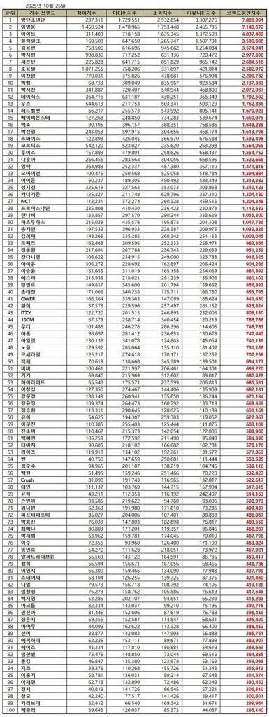 The rankings were based on data collected from September 25 to October 25, analyzing singers’ media presence, fan engagement, communication, and community buzz.
