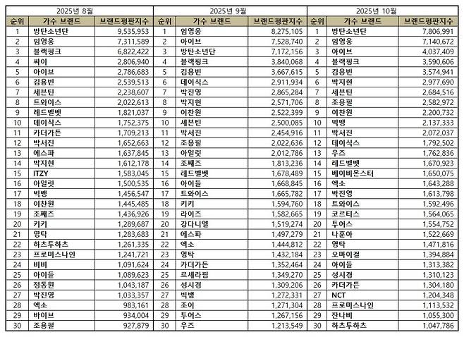 A representative from the research institute stated, “BTS, driven by their global fandom ARMY, took first place. Lim Young Woong, supported by his strong community ‘Hero Generation,’ followed in second. IVE, who continue to impress with steady growth, placed third.”