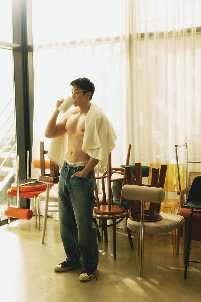 In the new image, Wonho is seen sipping a drink under the sunlight, wearing only a towel draped over his bare shoulders. His sculpted physique, glowing skin, and effortlessly sexy aura immediately caught the attention of fans around the world.
