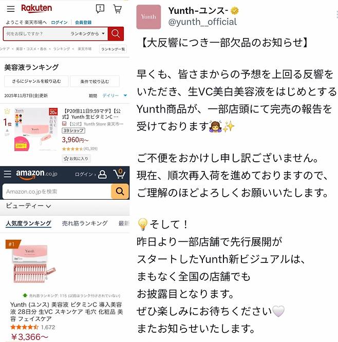 After the ad went live, Yunse immediately ranked first in real-time beauty product rankings on Japan’s largest online shopping site, Rakuten, and also topped the daily ranking on November 7.