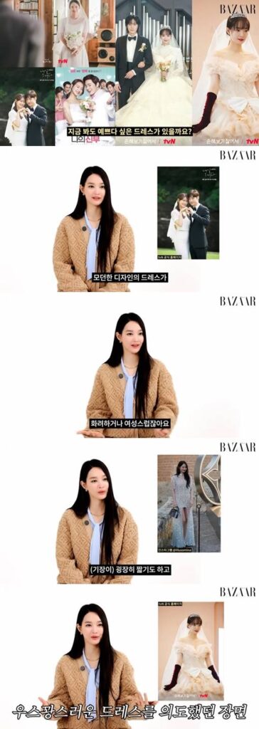 A new video on Harper’s Bazaar’s YouTube channel showed Shin Min Ah looking back on her past wedding dress looks. One clip showed a dress from her drama Tomorrow With You, and it immediately caught viewers’ attention. When asked which dress she still thinks is beautiful, she said, “The modern-designed dress I wore in Tomorrow With You. Wedding dresses are usually very feminine and fancy, but the modern one stayed in my memory.”
