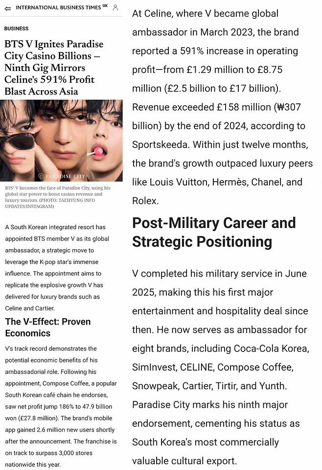 IBT explained that V’s role as ambassador is expected to replicate the explosive growth he has brought to luxury brands like Celine and Cartier. In 2023, while Korea’s top four luxury brands—Hermès, Chanel, Louis Vuitton, and Dior—saw operating profits decline, Celine’s operating profit jumped 591%, with sales increasing from 50.1 billion won to 307.2 billion won, a 513.2% rise.