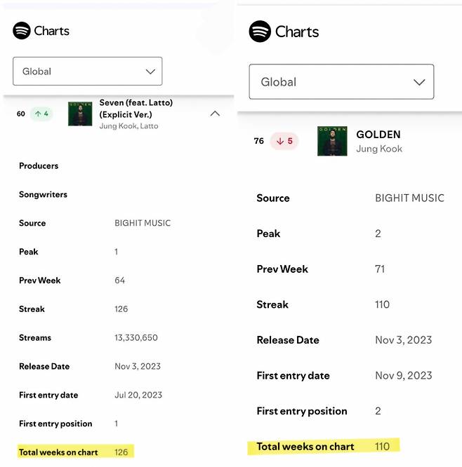 With this result, “Seven” has now charted for 126 weeks, setting a new record as the first and longest charting song by an Asian solo artist on Spotify’s global rankings. The song’s long run highlights its lasting appeal among listeners worldwide.