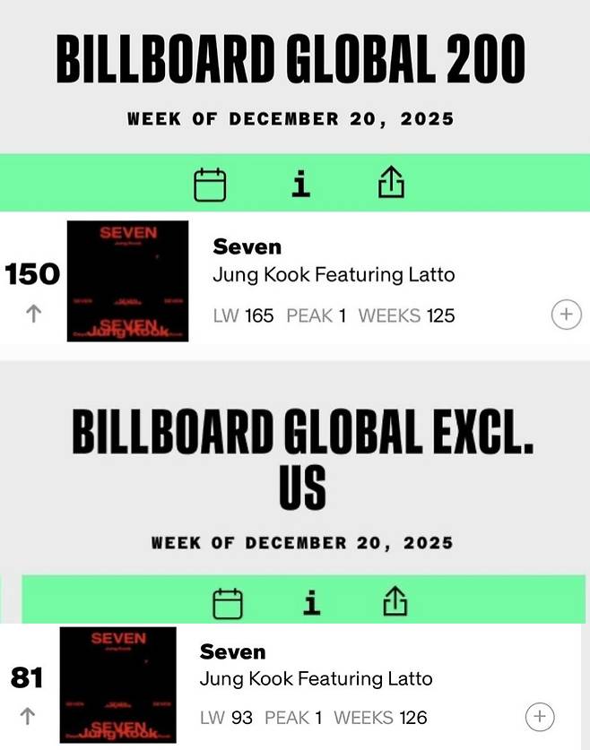 On the Global (excluding U.S.) chart, Seven rose 12 spots to No. 81, reaching 126 consecutive weeks. Jungkook is the first Asian solo artist to chart for this long, proving his strong and lasting presence on major Billboard charts.