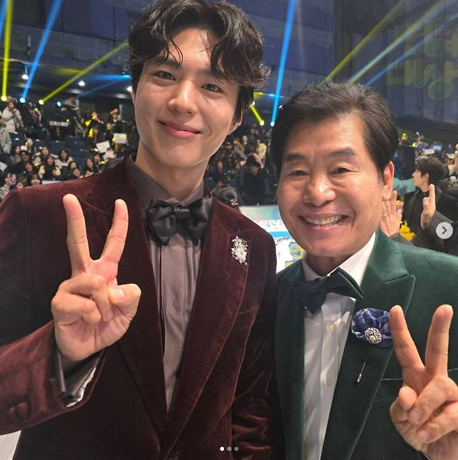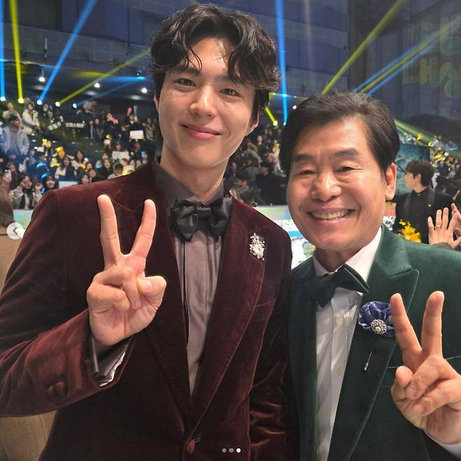 The pictures were taken on December 20 at KBS’s “2025 Entertainment Awards,” where the two stood side by side, making V signs. Matching in velvet suits, Park Bo Gum and Lee Yeon Bok smiled warmly at the camera, creating a friendly and elegant atmosphere.