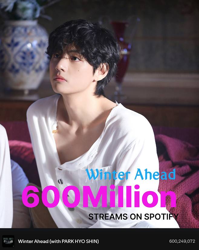 BTS V continues to show strong global influence as his song “Winter Ahead” has officially surpassed 600 million streams on Spotify.
