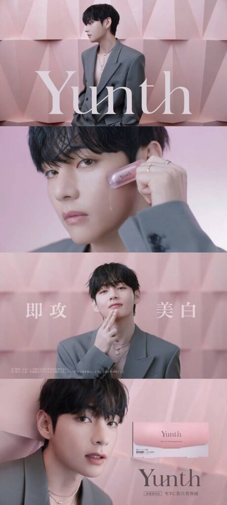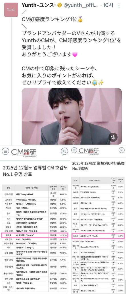 Japanese beauty brand Yunth announced that its TV commercial starring V ranked first in the cosmetics category based on a survey by the CM Research Institute. The institute analyzes viewer responses to advertisements aired on five major private TV stations in the Tokyo area, making the ranking a key indicator of ad impact.