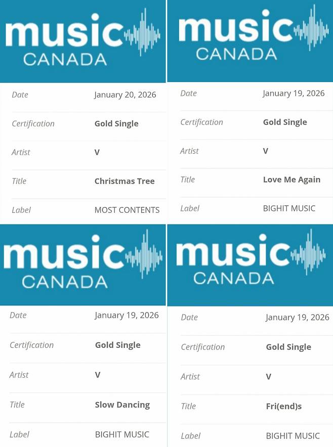According to Music Canada, V’s solo tracks Christmas Tree, Slow Dancing, Love Me Again, and FRI(END)S all earned Gold certification in the singles category.