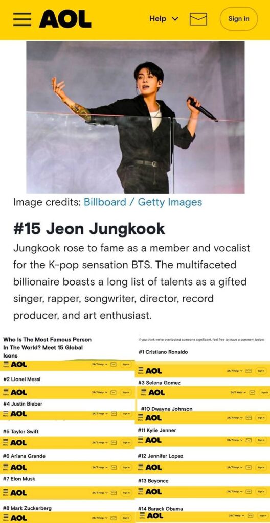 According to AOL’s latest list, Jungkook ranked No. 15 under his real name Jeon Jungkook, and was the only Asian to make the Top 15. He stood alongside major figures from politics, sports, business, and entertainment. Among male artists, only Jungkook and Justin Bieber were included.