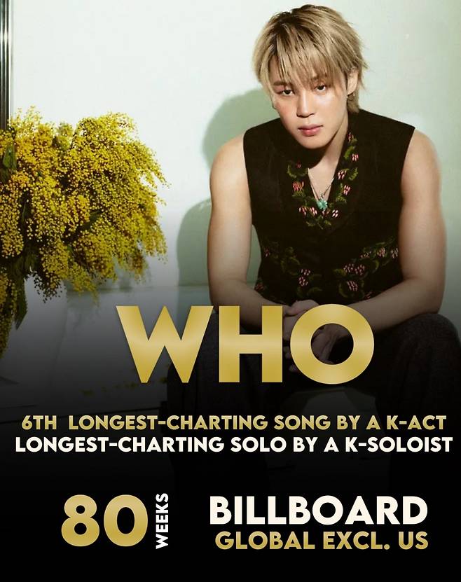According to Billboard, Jimin’s solo second album ‘MUSE’ title track ‘Who’ has officially charted for 80 weeks on the Billboard Global Excl. U.S. chart. With this milestone, ‘Who’ has become the first and only K pop solo song to spend 80 weeks on the chart.