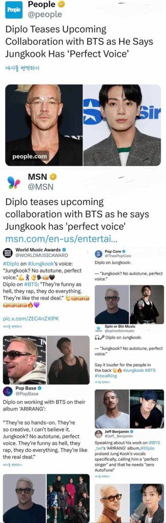 Billboard columnist Jeff Benjamin also highlighted Diplo’s statement, noting that the producer called Jungkook a “perfect singer” and emphasized that he “doesn’t need autotune at all.” Major outlets such as MSN and People also spotlighted the praise.