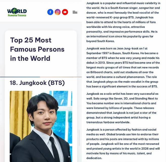 According to worldfamousthings.com, Jungkook ranked No. 18 on the list and was the only K-pop artist included.