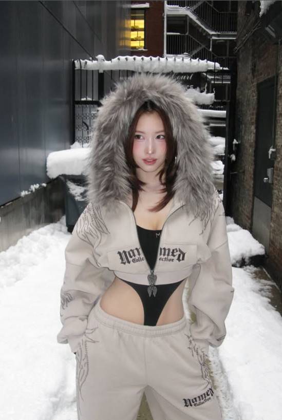In the photo, she stood confidently on a snow-covered alley wearing an outfit that revealed her toned abs and highlighted her perfect waist line.