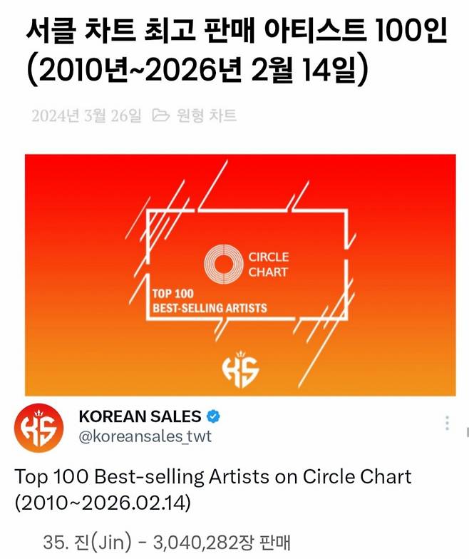 According to cumulative Circle Chart data counted from 2010 to February 14, 2026, Jin recorded a total of 3,040,282 album sales. He ranked No. 35 overall on the Top 100 list, an impressive result achieved as a solo act.