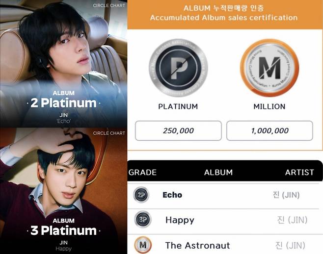 In terms of certifications, The Astronaut earned Million certification, HAPPY achieved 3× Platinum status, and ECHO received 2× Platinum certification on Circle Chart.