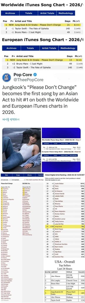 With this achievement, Jungkook became the first Asian artist in 2026 to top both charts with a B side track. Despite being released more than two years ago, the song surpassed several new releases to claim the No. 1 position, showing its strong staying power.