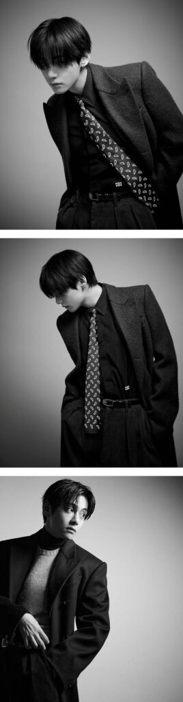 With his calm yet powerful charisma, he perfectly expressed Celine’s refined identity. Even in simple black and gray tones, his presence stood out effortlessly.