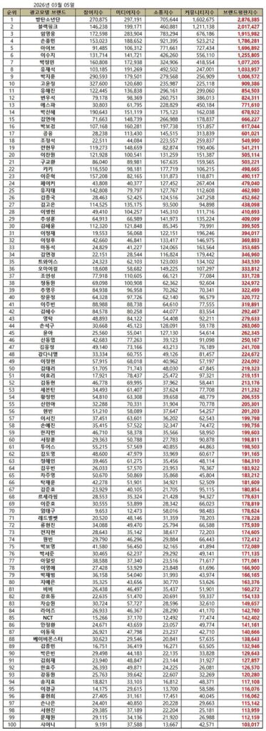The latest big data analysis for March 2026 advertisement model brand reputation rankings has been released, with BTS taking the No. 1 spot, followed by BLACKPINK in second place and Lim Young Woong in third.