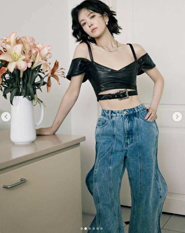 In the photos, Song Hye Kyo posed in jeans and a leather off shoulder top, pairing the outfit with a short permed hairstyle and smoky makeup that gave her a stronger and more dramatic image than usual.