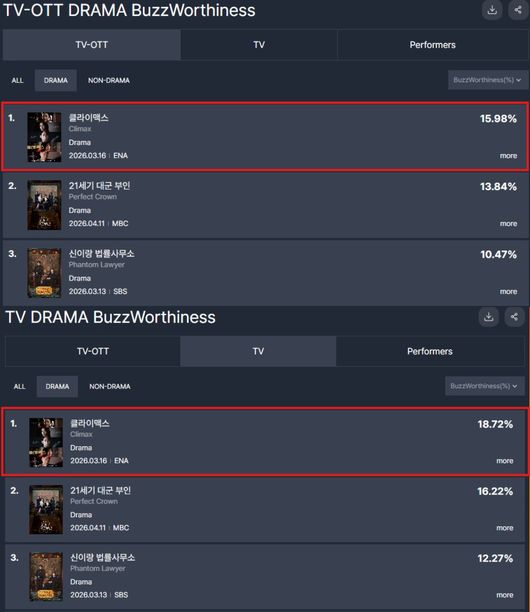 The buzz around the drama is not stopping there. ‘Climax’ also ranked No. 1 on Good Data Corporation’s FUNdex in both the TV OTT drama and TV drama buzz rankings, proving that it is not only performing in ratings but also dominating conversation online.