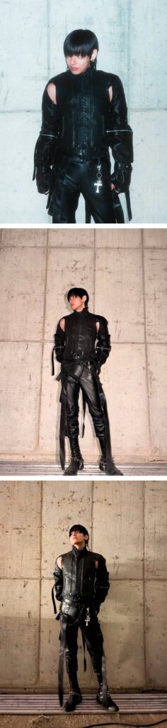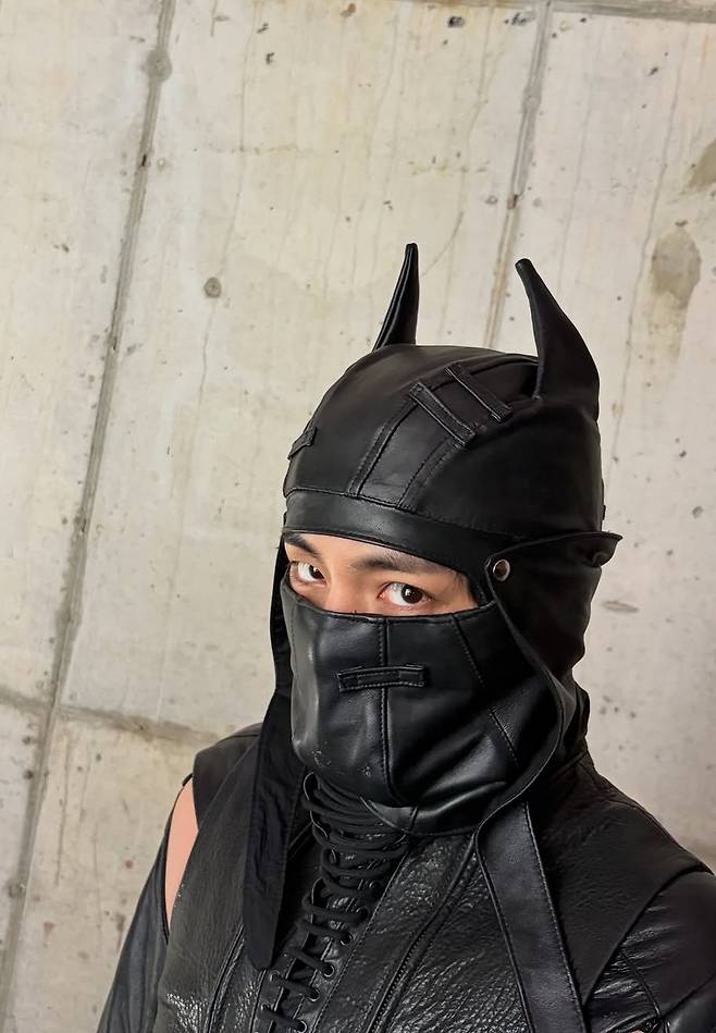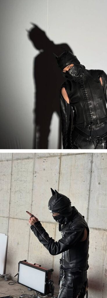 In the images, he appeared in a full black leather outfit with a mask, creating a cinematic and intense mood that stood out to fans.