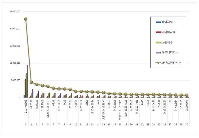 According to the Korea Corporate Reputation Research Institute, BTS ranked number 1 with a brand index of 22,897,786, marking a 165.57 percent increase compared to March.