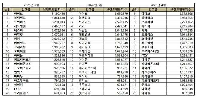 IVE has secured the top spot in the April 2026 girl group brand reputation rankings, showing continued strong presence despite slight changes in scores.