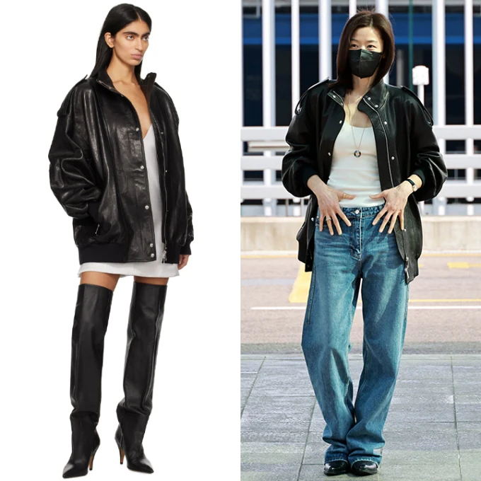 Her outfit featured a white sleeveless bodysuit paired with low-rise denim, highlighting a clean and slim silhouette. She completed the look with an oversized black leather jacket, adding a bold and modern touch.