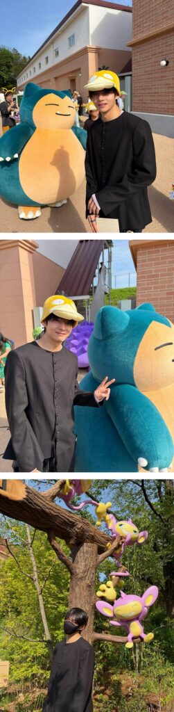 V also shared moments from different areas of the park, including a themed club where he wrote “Entering the club,” and a lab style space where he joked, “Ah, I woke up late so Professor Oak is not here,” bringing smiles to fans.