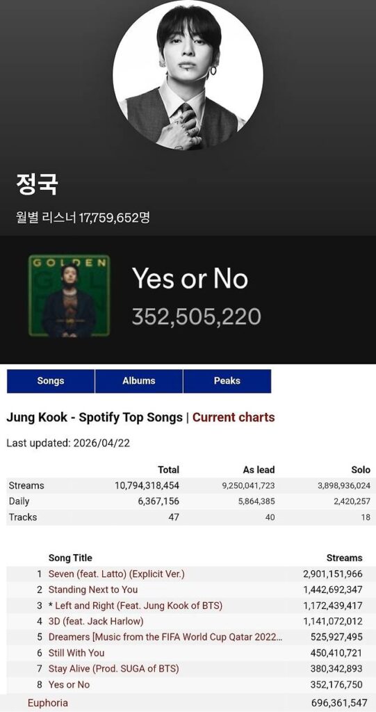 With the addition of “Euphoria,” his solo track from a BTS album, Jungkook now has a total of 9 songs that have exceeded 350 million streams on Spotify, highlighting his consistent global popularity.